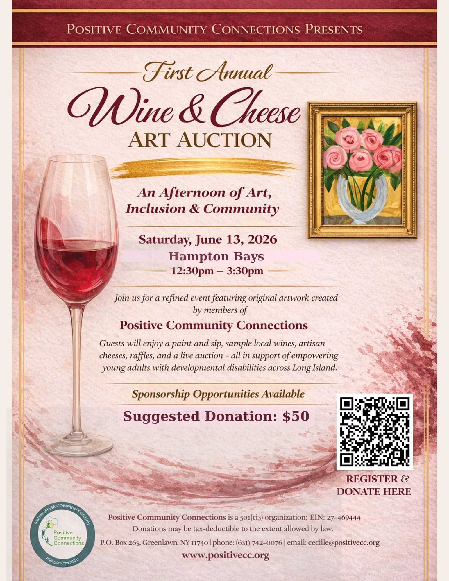 Please join Positive Community Connections as we host our First Annual Wine and Cheese Art Auction in Hampton Bays. This signature fundraising event will showcase original artwork created by our members while bringing together local business leaders, families, and community supporters for an afternoon of connection and celebration.