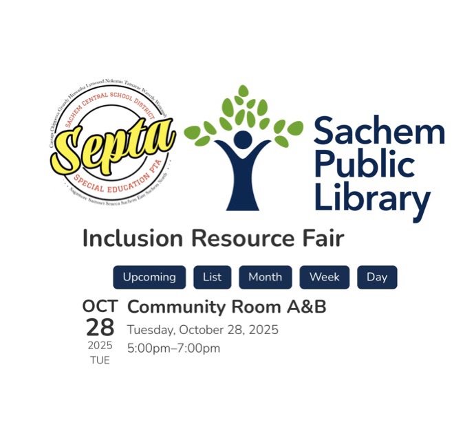Come join Sachem SEPTA, The Sachem Public Library, & Sachem Central School District to connect with agencies that provide services to help children and adults of all abilities. Seek out resources from organizations like Parent to Parent, Little Angels, Viability, Winters Center for Autism, Camp Paquatuck, Achieve Beyond, Theralympic Speech, LI Strive, Gigis Playhouse, Speech Therapy for All, The Music Academy for Special learners, FREE, Collaborative Minds, & more!!
