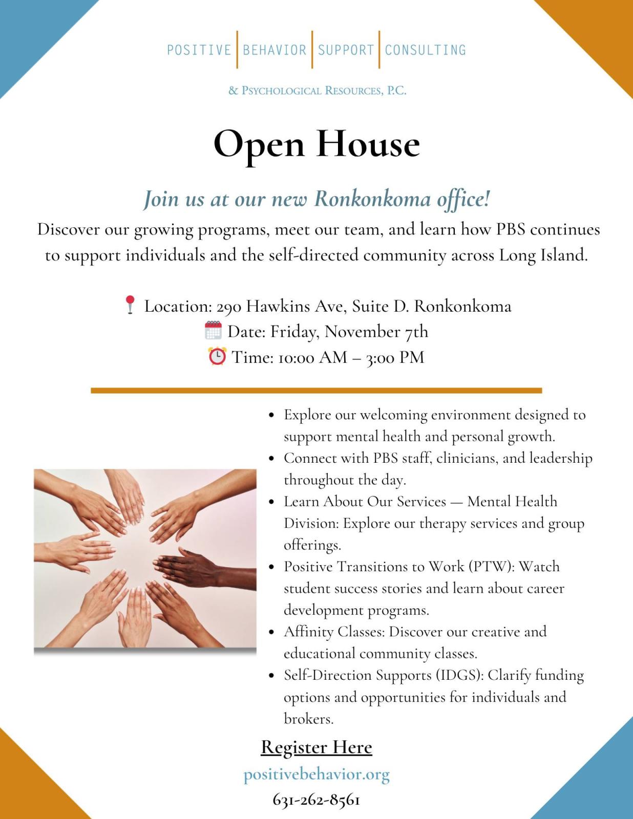 PBS Consulting & Psych Resources is excited to welcome you to our Open House on Friday November 7th, from 10:00 AM to 3:00 PM at our new Ronkonkoma office (290 Hawkins Ave, Suite D).