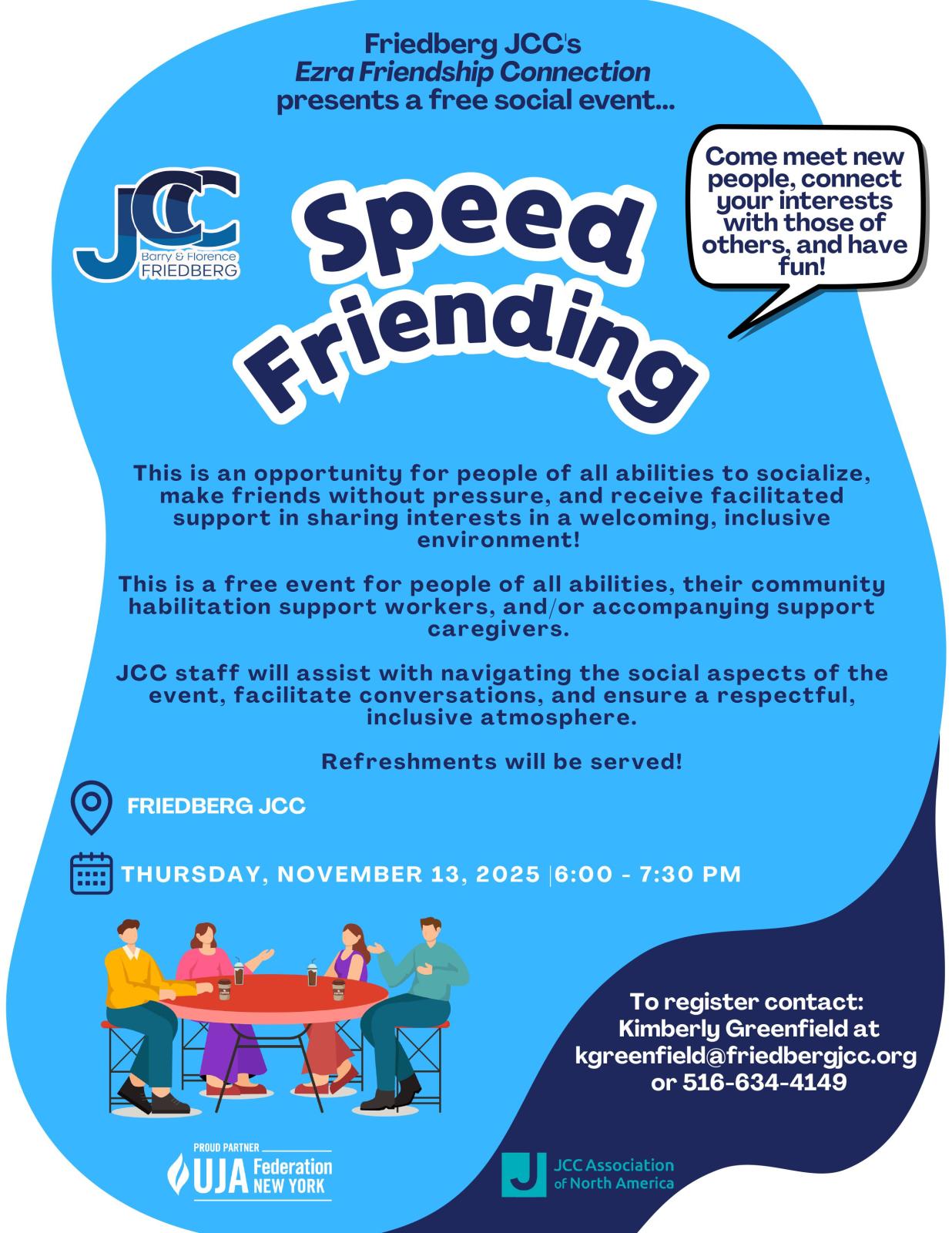 I am pleased to share information about an upcoming Speed Friending event on November 13th at 6pm at Friedberg JCC.